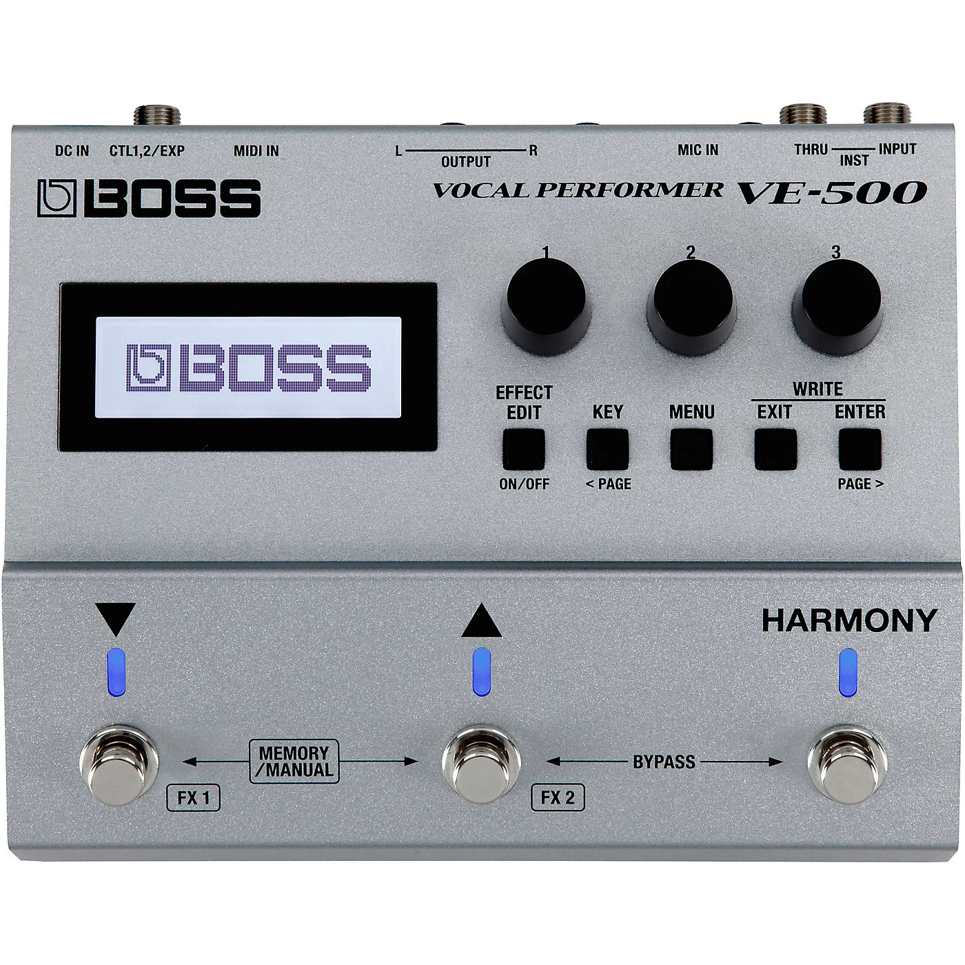 Packing professional sound quality and serious BOSS DSP muscle, the VE-500 delivers sophisticated harmony and pitch correction functions that automatically track the chords you play on your guitar. It also includes a powerful vocoder and core sound-enhancement tools, plus world-class reverb, delay, and modulation sounds and specialty effects like distortion, filtering, and many others. And with programmable memories, you can instantly recall favorite setups for any song or style. The VE-500 is the perfect addition to the pedalboard of any singing guitarist, providing top-flight vocal processing that fits right alongside your standard guitar effects. If you’re like most guitarists, you spend a lot of time choosing the right amps and pedals to craft your own personalized sound. But if you sing in your band as well, it hasn’t always been so easy to give your vocal sounds that same attention to detail—until now. The advanced VE-500 Vocal Performer provides everything you need to achieve impressive vocal harmonies and effects on stage, and all in streamlined stompbox that integrates seamlessly with the regular guitar effects on your pedalboard. Filled with deep sound-shaping capabilities, the VE-500 is a professional vocal toolkit that lets you process your voice any way you like, from subtle sweetening to the dramatic, over-the-top effects heard on so many modern records. And with its newly enhanced harmony and pitch engine, you can easily expand your sound with real-time vocal harmonies and more. The VE-500’s stompbox configuration makes it simple to integrate with any pedalboard—just plug your guitar into the instrument input to drive the harmony, pitch, and vocoder functions, and then use the Thru output to feed an unprocessed signal to your other pedals. And with the VE-500’s stereo XLR outputs, you’re able to send your processed vocal sounds directly to a PA mixer, stage monitor, or recording device. Are you short of good backing singers in your band? The VE-500 is the perfect solution, making it easy to elevate your songs with rich, ear-catching vocal harmonies. Its automatic harmony engine is powered by advanced BOSS processing that detects the chords and key you play with your guitar, generating smooth and natural two- and three-part harmonies in real time as you sing. And by working with the VE-500’s different harmony modes, you’re able to refine the harmonies as needed for songs that have more complex key structures. The harmony engine can alternately be driven via MIDI (through either the VE-500’s MIDI or USB inputs), enabling you to generate pitch- perfect live harmonies with a MIDI keyboard or DAW-based backing tracks. The VE-500 contains wide-ranging effects with deep editing parameters for crafting nearly any vocal sound imaginable. In addition, highly flexible routing options are available for processing live and harmonized vocals together or separately. Use the Enhance section to polish your voice with essentials like compressor, de-esser, and EQ, then tap into the two dedicated Reverb/Delay sections for everything from subtle coloration to lush, expansive clouds of ambience. Four independent FX engines are available as well, and each contains an enormous selection of effects types. Spice things up with a little chorus, flanger, or tremolo, add some secondary reverb or delay, or take things over the top with distortion, radio voice, ring mod, slicer, filtering, and more—the sky’s the limit. Another killer VE-500 feature is its powerful vocoder function, which is derived from BOSS’s unique and innovative VO-1 Vocoder pedal. By vocalizing into the connected mic as you play, you can transform your guitar’s tone with electronic voices and an array of all-new colors for modern music styles. It’s even possible to replicate traditional talk box sounds, providing instant access to classic “talking lead guitar” tones without having to use a talk box rig and mouth tube. The VE-500 also includes a dedicated pitch correction section, which is guided via guitar or MIDI just like the harmony function. You can employ it for transparent pitch stabilization, which is especially useful if you’re not such a great singer but still need to contribute some lead and/or backing vocals to your band’s sound. It’s also possible to switch in alternate modes that provide the heavily effected sounds heard on modern hits, including hard pitch correction, electronic tonalities, and even robot-voice sounds.