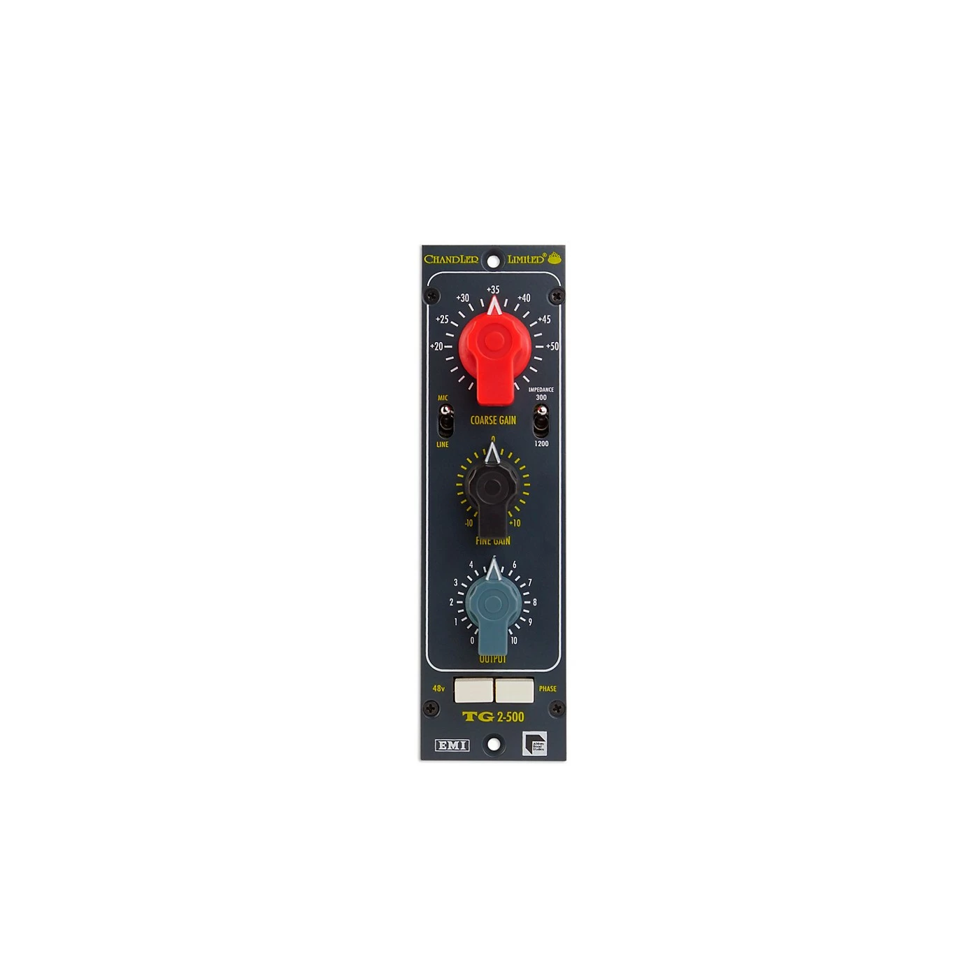 The Chandler Limited TG2-500 pre-amp is a recreation of the rare EMI TG12428 pre amp used in EMI/Abbey Road Studios recording and mastering consoles from the late ’60s and early ’70s. The sound of the EMI/Abbey Road Studios equipment is world renowned and imparts a unique and pleasing sonic character as heard on many famous recordings done at Abbey Road including The Beatles’ “Abbey Road” and Pink Floyd’s “Dark Side of the Moon” albums. For the first time ever, the legendary TG2 pre-amp sound is available in 500 Series format. The TG2-500 microphone pre-amplifier features the same discrete, transformer-balanced amplifiers as Chandler Limited’s TG series: TG2 Pre Amp/DI, TG Microphone Cassette, TG12411 Channel (TG Channel MKII), and TG1 Limiter. The microphone pre-amplifier and line amplifier have been taken from the highly acclaimed TG2 Pre Amp/DI and packaged or the industry standard 500 Series format, while retaining the sound of Chandler Limited’s TG2 Pre Amp/DI. The aural quality has often been characterized as a creamy, smooth tone with a surprisingly open, clear top-end. The sound has warmth and punch, but with a beautiful expanded top end. In fact, the TG2-500 microphone preamplifier does have a small rise in its top-end frequency response and some warmth inducing distortion, which contributes to its sound.