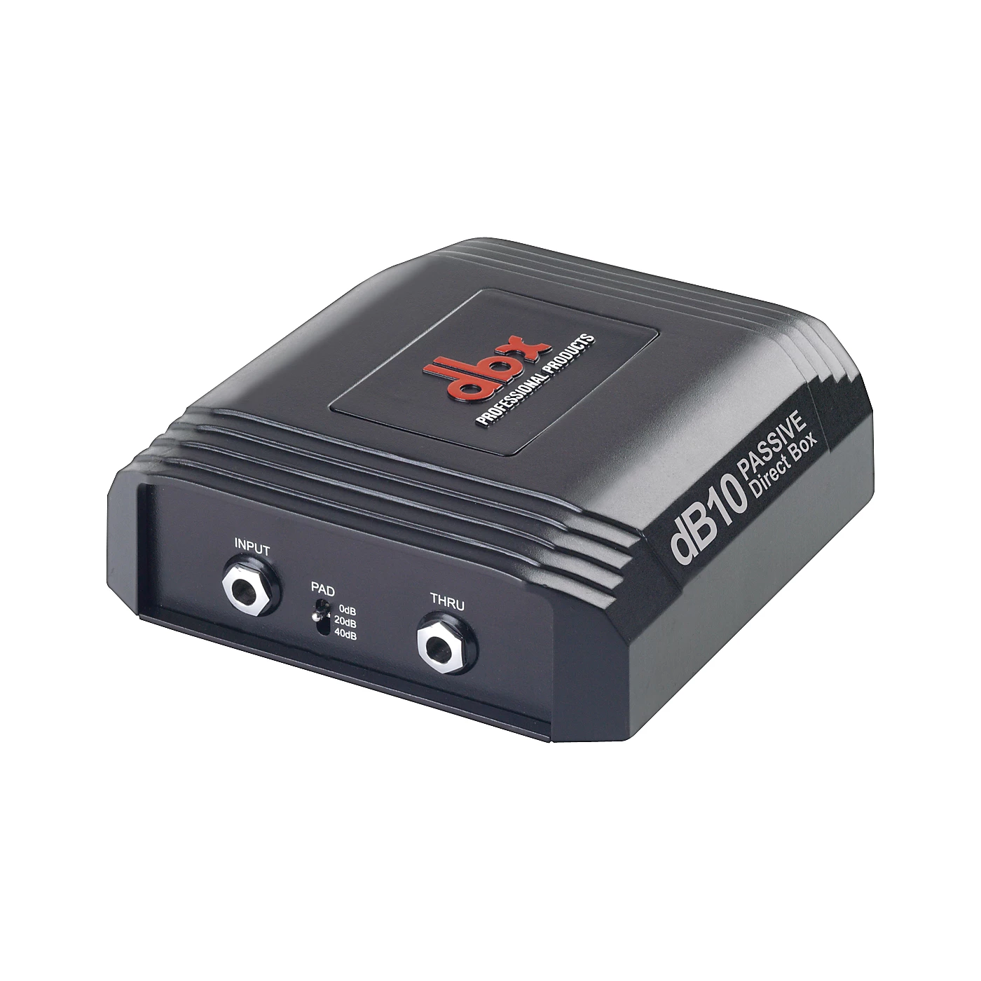 The dbx dB10 is a passive direct box that features custom dbx mu-metal-shielded audio transformers, high-quality Neutrik connectors, and low-noise circuitry. The dB10 direct box includes a pad switch that accommodates instrument, line, and even speaker level signals. Take even more control of your sound by utilizing the dB10 passive direct box’s polarity invert switch to set the phase relationship between the direct and the mic’d sound. As a professional, you don’t have time for interference, so dbx includes a ground lift switch in the db10 passive DI box to solve potential hum and buzz problems due to ground loops. And between the combined shielding of the db10’s cast metal chassis and the custom-wound transformer, you can be doubly assured of a clean signal free from interference. All of this sits atop the dbx dB10 direct box’s solid, stable footprint, that keeps the dB10 box from being dragged around the stage. The dbx DB10 Passive Direct Box also has a uniquely contoured underside that allows secure stacking of multiple units.