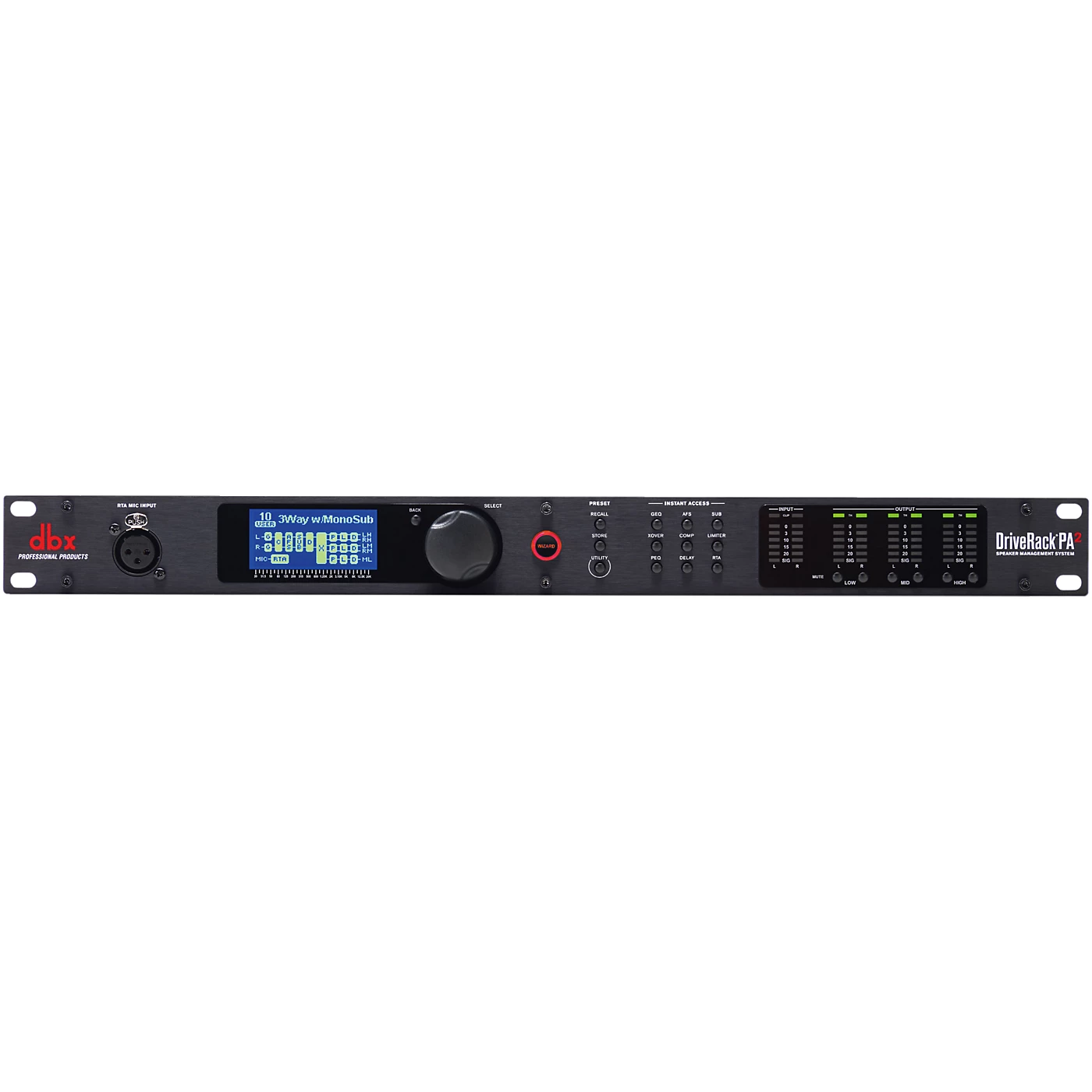 The dbx Driverack is one of the most innovative and helpful tools to come along for the live sound engineer in decades. It incorporates crossover, EQ, compression, delay parameters and much more within individual presets. These presets can then be applied to specific rooms, expected environments and applications. The dbx Driverack PA2 incorporates heavily researched and well-considered improvements in the original Driverack system.The DriveRack PA2 provides all the processing you need between your mixer and amplifiers to optimize and protect your loudspeakers. With the latest advancements in dbx’s proprietary AutoEQ and AFS algorithms, a new input delay module for delaying the FOH system to the backline, Ethernet control via an Android, iOS, Mac, or Windows device, and updated Wizards, the DriveRack PA2 continues the DriveRack legacy of great-sounding, powerful, and affordable loudspeaker management processors, for a whole new generation.AutoEQNew, improved AutoEQ algorithm ensures an extremely accurate, fast, and non-intrusive automatic EQ experience.With the RTA Mic “listening” to your room, the new, updated DriveRack PA2 AutoEQ algorithm sets speaker levels and room EQ automatically in a matter of seconds. This means room adjustments can now be made very quickly, without subjecting the audience to annoying, lengthy broadcasts of pink noise.Enhanced AFS Feedback EliminationEnhanced AFS algorithm for faster, more precise feedback elimination, without adversely affecting your system’s tone.Nothing turns audiences away like annoying and potentially painful audio feedback. Fortunately, dbx engineers have revisited their already-stellar Advanced Feedback Suppression algorithm and made it work even better. The DriveRack PA2 listens for and anticipates feedback and adjusts speaker output automatically before it even has a chance, while never altering your sound.Updated Wizard Setup FunctionsUpdated Wizards make initial set up easy, while ensuring speaker tunings and other settings are up-to-date.Wizard functions on the DriveRack PA2 guide you through easy, step-by-step processes to help you get the most from your loudspeaker system. Helps you easily configure level balancing, AutoEQ, Advanced Feedback Suppression, and provides access to built-in and constantly updating speaker tunings from most major speaker manufacturers.Available Input Processingdbx CompressionAFS (Advanced Feedback Suppression)Graphic EQ8-Band Parametric EQ (adjusted when using the AutoEQ)Subharmonic SynthesisAvailable Output ProcessingCrossover (supports full range, 2-way, and 3-way systems)8-Band Parametric EQs (used for speaker tunings)dbx LimitingDriver Alignment Delays