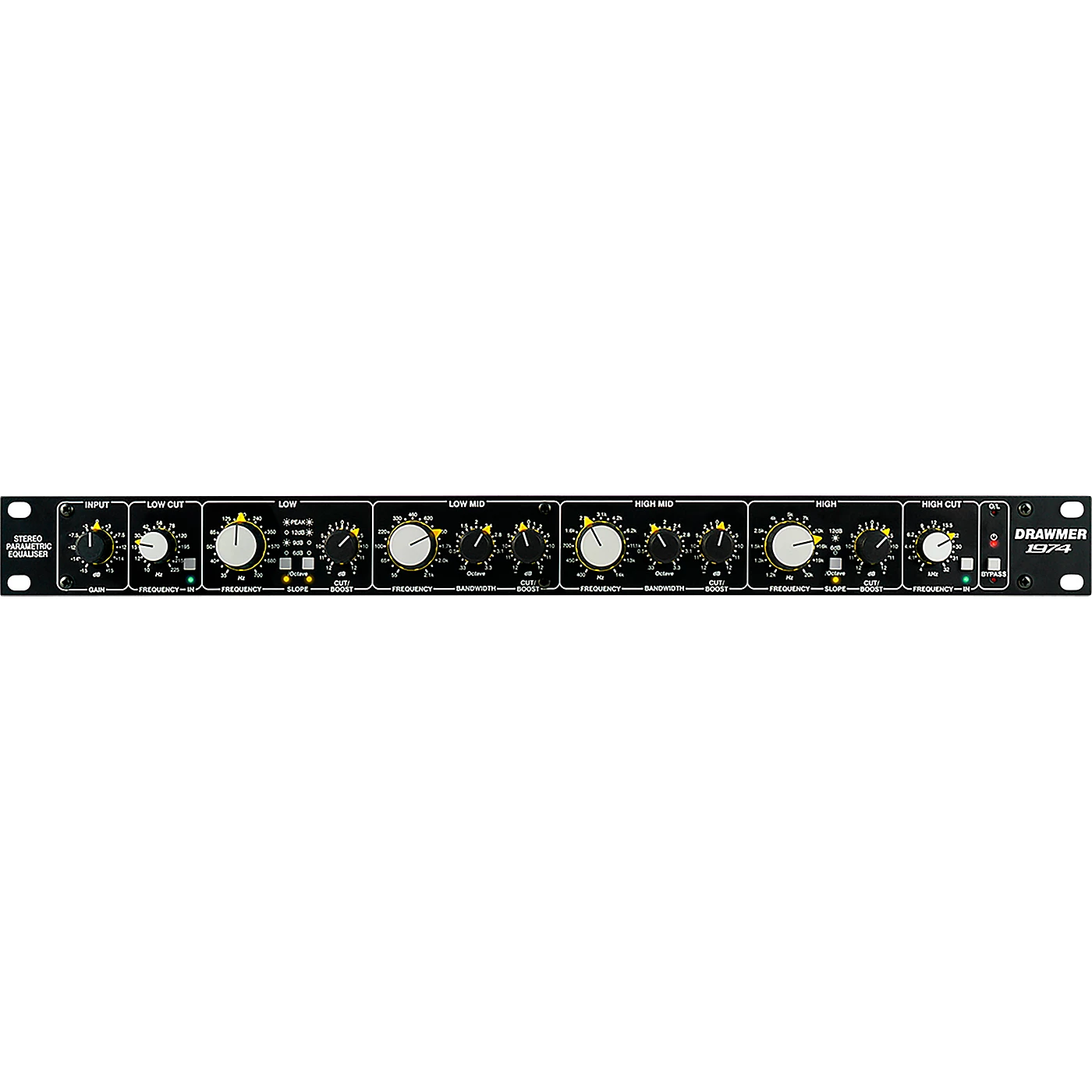 The vintage-style fully stereo 1974 four-band Parametric Equalizer provides exceptional analog musicality and sonic clarity, taking its inspiration from 1970s-era gear. It has the ability to perform subtle shaping for mastering purposes that require a delicate touch and easy recall, but is just as capable of tonal sculpting—adding the analogue warmth and character that is near impossible to emulate in the digital domain. Get immersive with the stereo operation, with one set of controls for both channels. The versatile design features dual channel precision stepped potentiometers, providing exceptional accuracy for fast and simple recall. The fully variable bandwidth allows you to control the parametric mid bands, making adjustments as surgically precise or as broad and natural sounding as you could ever require. Fully adjustable low and high cut filters are also included, ideal for tuning out undesirable signals at the frequency extremes. It also features a switchable slope allowing you to alter the focus at the high and low frequencies plus a low peak setting that magnifies the bottom end. The 1974 is perfect for tonal shaping, staying true to the sound of the 70s and ideal for any musician.Genuine Stereo Operation with Indented and Accurate PotentiometersThe genuine stereo linked operation of the 1974 makes adjustment quick and simple using just one set of controls to alter both channels. No more fiddling with every control trying to match the settings of the left and right channels with each other. The 1974 uses precision potentiometers, each one being matched for left/right accuracy to within fine tolerances by trained technicians, so both channels operate identically, and also have indented operation, providing exceptional accuracy for fast and simple recall.Fully Parametric with Totally Variable BandwidthThe 1974 is a true parametric equalizer, with the four bands having fully variable frequency controls and offer cut and boost of +/-12dB’s. However, unlike EQs with a no bandwidth adjustment or a simple switch, the two mid bands have completely variable filter bandwidth controls. This enables the user to focus in on very narrow sections of the audio spectrum or apply a broad natural sounding filter, or, of course, anything in between the two. The 1974 incredibly versatile and capable of modifying everything from subtly fine tuning mixes to tone sculpting problematic recordings.Variable Low and High Cut FiltersThe 1974 also includes fully variable low and high cut filters, ideal for tuning out undesirable signals. The low cut (otherwise known as High Pass Filter) having a range of 10Hz-225Hz and the high cut (otherwise known as Low Pass Filter) 4kHz-32kHz. The beauty of being fully variable is that, unlike fixed frequency filters, it is easy to sweep both controls to find the perfect setting and remove sounds with pinpoint accuracy. This is especially useful when bracketing individual tracks where it will be necessary to cut the bass to remove rumble and top to remove hiss, as these undesirable signals will just add up as the tracks are layered. Switchable Slope SettingVery few analog parametric equalizers have an adjustable slope on the low and high cut filters, and is yet another feature of the 1974 that allows you to take control of your audio. The filter slopes of the 1974 have been chosen for their musicality – allowing you to adjust the focus of the audio at the bottom and top ends of your recording but not so harsh as to be a very noticeable brick wall filter. At the bottom end slopes of 6, 9 and 12dB per octave plus a Peak setting are available, and at the high end 6 and 12dB’s per octave. The Peak setting adds a narrow bell shape to the 12dB per octave low cut filter at the knee frequency just before it rolls off. Especially useful on kick drums, it magnifies and gives extra weight to the hit whilst still filtering out any subsonic junk and without muddying the lower mid. It’ll give your kick an added sense of power and precision.