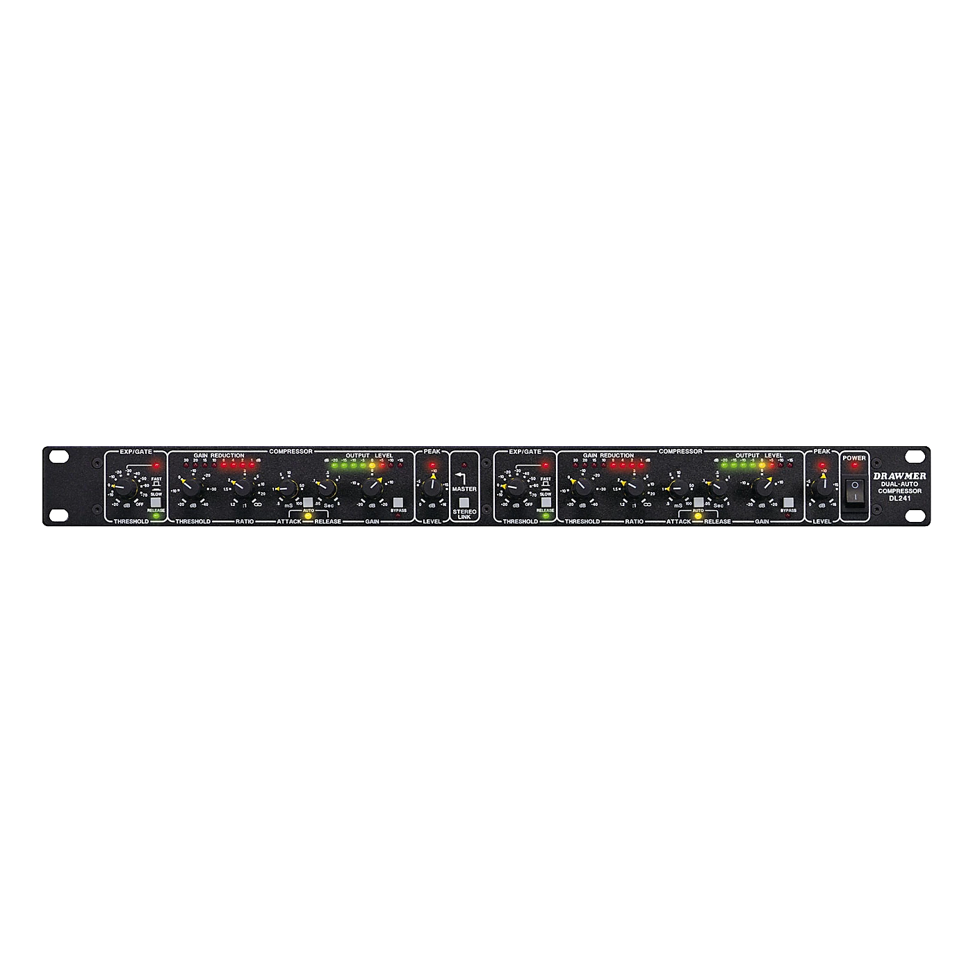 The Drawmer DL241 Dual Channel ‘Auto-Compressor’ highlights the beginning of a new generation of dynamic processors which set new standards of sonic excellence. Its combination of features, displays and well designed control functions make it an outstanding product for a vast range of broadcast, sound reinforcement, and recording applications. The DL241 ‘Auto-Compressor’ incorporates many automatic functions allowing the engineer to achieve optimum results in the minimum set up time but does not compromise skilled users with limited controls. Its sophisticated design produces a smooth, transparent and warm sonic performance. Facilities available on the DL241 include: Expander/Gate. Drawmer’s unique “Programmed Adaptive Expansion” circuitry allows effective ‘single control operation’ producing a fast smooth response and eliminating ‘chatter’ on or around threshold. This design differs from that of conventional Expanders in that the Expansion Ratio, Hold Attack and Release continually adapt themselves to the dynamics of the incoming signal. The Expander/Gate provides 80dB range and variable threshold from +20dB to 70dB with an OFF position._Switching is provided for ‘Fast’ or ‘Slow’ release characteristics. The ‘Fast’ mode can be used for instruments with rapid decay times or for additional tightening of the gating effect. The ‘Slow’ mode is more suitable for vocals and instruments with longer decay times or can be used to smooth over rough fade outs. A single LED indicates gating action. Compressor. A full Auto Attack/Release Compressor with variable Threshold and Ratio successfully combines the smoothness of the ‘Soft Knee’ principle with the precision of a ‘Ratio’ control. The advantage of this combination is that instead of the onset of compression being sudden at the threshold point the ratio increases over a 10dB input level range until it reaches the ratio set on the front panel control, thus achieving a more natural sounding compression._Selectable manual or fully automatic Attack and Release times dramatically extend the application range and user scope of the DL241. Selecting the ‘Auto’ mode removes the need for manual adjustment and is particularly valuable when the program being treated does not have predictable or consistent dynamics, often the case when processing a complete mix or a virtuoso bass guitar performance. Under manual control the wide range of adjustment available gives the user the ability to create dynamic effects as well as normal compression. Peak Level. ‘Zero Response Time’, ‘Zero Overshoot’ circuitry provides an absolute limit to the peak level of the output signal, adjustable from OdB to +16dB above system level. When set to the required level, any excessive peaks will be stopped and the gain momentarily decreased if necessary. The ‘Zero Response Time’ is essential to avoid unpleasant distortion when mastering for CD or sending any signal to digital equipment. ‘Zero Response Time’ means that the DL241 provides complete protection from even the fastest and shortest signal ‘spikes’ (overloads), making the unit also ideally suited for speaker system protection in sound reinforcement applications. Metering. Comprehensive bar graph displays give ‘at a glance’ indications of gain reduction, and output signal level Gain reduction from 1dB to -30dB is shown simultaneously with signal level from -20dB to +15dB Other single LEDs indicate function status of Gating Acton, Auto Mode, Bypass, Peak Limiting, Stereo Linking, and Power On. Stereo Link. When processing stereo signals, linking should be used to prevent image shifting. This facility ties both channels together. Using channel 1 (left) as the master channel removes the need to duplicate control settings for both channels. Bypass. A fully balanced hard-wire bypass connects the input directly to the output allowing signal to pass through the unit with no power applied. In bypass the VU level meter displays the Input signal. Operating Level. The operating level of the DL241 can be instantly switched, independently on each channel, for either +4dBu or 10dBu operation using a rear panel push switch. Input/Output. The DL241 is available with either XLR connections and fully balanced inputs and outputs, or with stereo jack (TRS) connections, fully balanced inputs and single ended outputs.