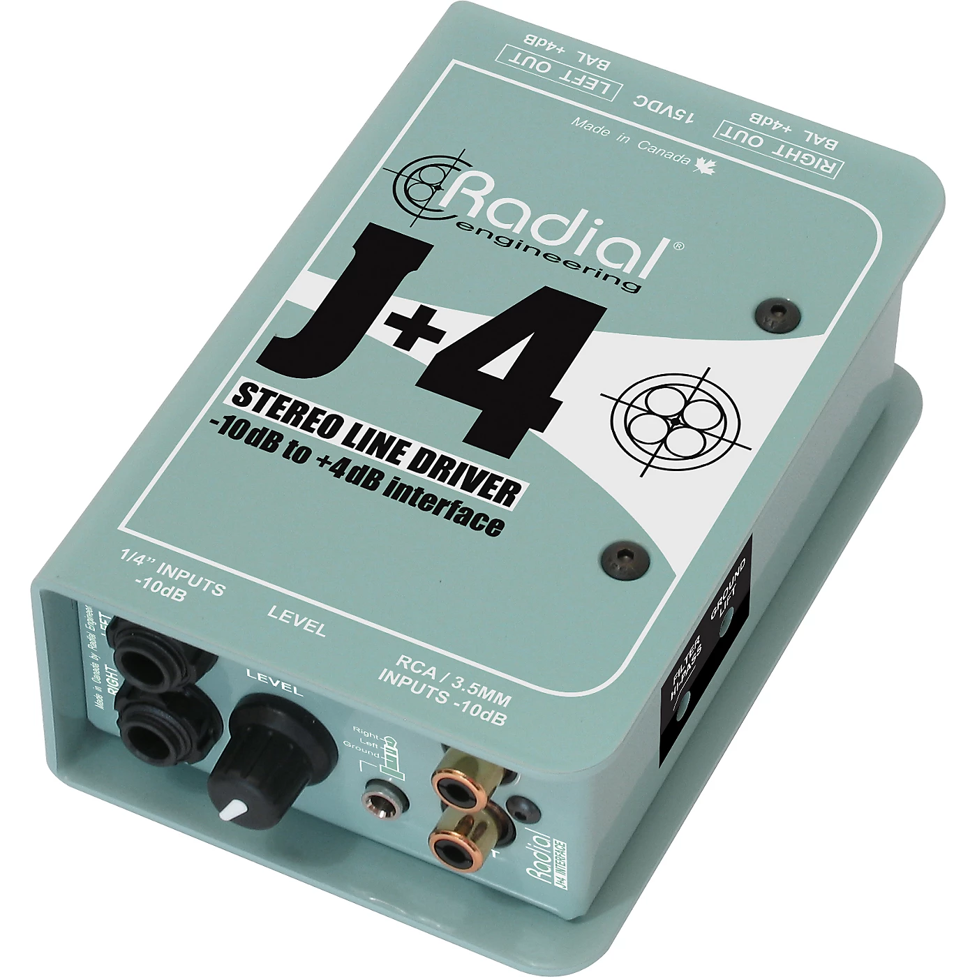 The Radial Engineering J+4 Stereo Line Driver accepts consumer level -10dB unbalanced high impedance signals and converts them to +4dB balanced low impedance signals. If your needs involve pro audio, whether in broadcast, recording studios, or live touring, you’ll find the Line Driver box invaluable.Radial paid careful attention to noise elimination by combining the advantages of active signal buffering with transformer isolation. The J+4 delivers better than 95dB signal-to-noise. It also keeps hum and buzz caused by ground loops and spurious clocking noise from polluting the signal path. For reliability and ease-of-operation, Radial kept controls on the J+4 to a minimum. Input connectors include a stacked set of 1/4″ jacks for DJ mixers or keyboards, RCA’s for CD players and a mini 3.5mm for I-pods.High Pass FilterThe Radial stereo J+4 is equipped with a handy high-pass filter that is used to cut low frequencies below 100Hz. This provides several important benefits. First and foremost, when playing back audio tracks through a PA system, excessive bottom end can produce low frequency resonance which in turn can cause runaway feedback. It is also important to note that bass frequencies contain significantly more energy than higher frequencies. Reducing bass content can dramatically increase your system’s dynamic range. Finally, by reducing unneeded low frequencies, it really helps clean up the mix. Built toughAs with all Radial products, the Radial J+4 is built tough to handle the extreme rigors of professional touring. A unique 14-gauge steel I-beam inner frame ensures the sensitive PC board will not be subjected to outside stress which could potentially cause solder joints to fail. An innovative book-end outer shell creates protective zones around the sensitive controls, switches and connectors to further improve dependability while a full bottom no-slip pad provides both mechanical and electrical isolation.The Radial J+4 balanced line driver delivers exceptional sonic performance, plenty of headroom and ultra-low noise making it the ideal companion in today’s more demanding professional audio systems.