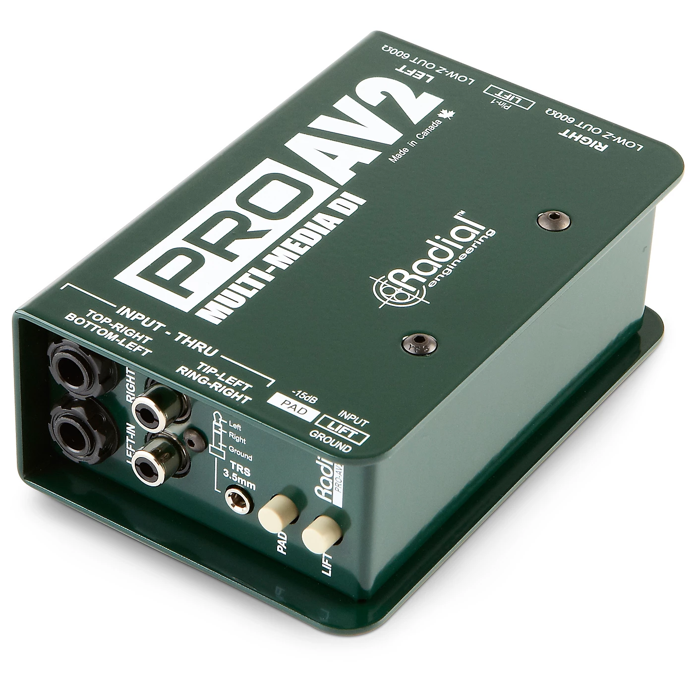 The Radial ProAV2 is a passive direct box specifically developed with the audio-video integrator in mind. It has full two-channel stereo functionality.To eliminate the need for various adaptor, a “Swiss Army” array of connections are provided, including 1/4″ for instruments, RCA and 1/8″ connectors for consumer electronics and computers, and a +4dB XLR input for professional systems. Front panel connectors can also be used as thru-puts to allow multiple patch points.Custom wound transformers are employed, which are able to withstand exceptionally hot levels while maintaining linearity from 20Hz to 18.5kHz. The resulting smooth Bessel curve is warm and natural, making the ProAV2 Passive DI box particularly adept at handling digital sources that can sound harsh. Transformer isolation adds the benefit of eliminating ground loops that cause audio hum and buzz and video hum bars or snow.