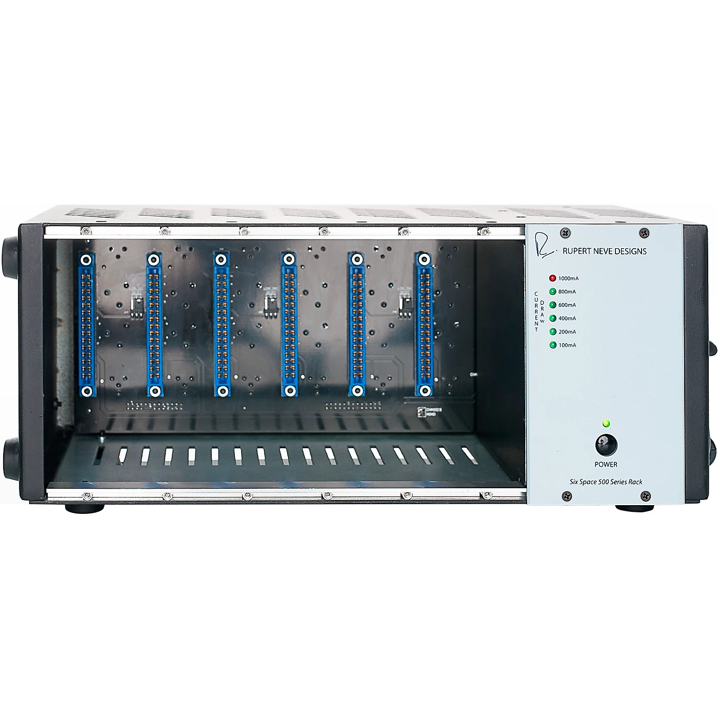 Power-wise, the R6 has more than 150% the required current for a 6-space chassis to prevent the power rails from failing under a higher-than-expected load. To help monitor and troubleshoot problematic modules, the R6 is equipped with LED current metering to show how much power is being used. The internal power supply itself has been carefully designed and double-shielded to avoid significant magnetic induction in any of the channel positions. With such attention to providing and monitoring power, the R6 helps your modules realize their fullest potential.Connect Like Never BeforeWith a plethora of connections available, the R6 backpanel is practically a patchbay on its own. The R6 features 8 channels of balanced I/O options including DB-25, XLR and TRS that may be used interchangeably. This versatility is especially handy when you are taking the R6 with you to another environment where you are unsure of the cables available, or if you need to convert DB-25, XLR or TRS connections to another format using the THRU functionality on channels 7-8. Solid Steel ConstructionThe chassis is comprised of solid steel with bumpers to support the unit in both horizontal and vertical configurations, and features a collapsable handle for portability. All connectors and fittings are of the highest quality to ensure that the R6 will hold up to many years of use.A New Level of Confidence in the 500 SeriesBecause the R6 is built to 500 series specifications, it will work flawlessly with any properly-designed 500 series module you wish to include in it. To help accommodate modules that are slightly out of spec, the R6 has variable-position screw holes to help make the installation process as smooth as possible. The 500 series VCA buss link function can be enabled in pairs on the R6 using the link jumpers on Channels 1-2, 3-4, or 5-6. Enabling link allows compatible compressor modules like the 543 to share VCA control when their links are enabled. Matching blank panels are also available to cover any empty slots.
