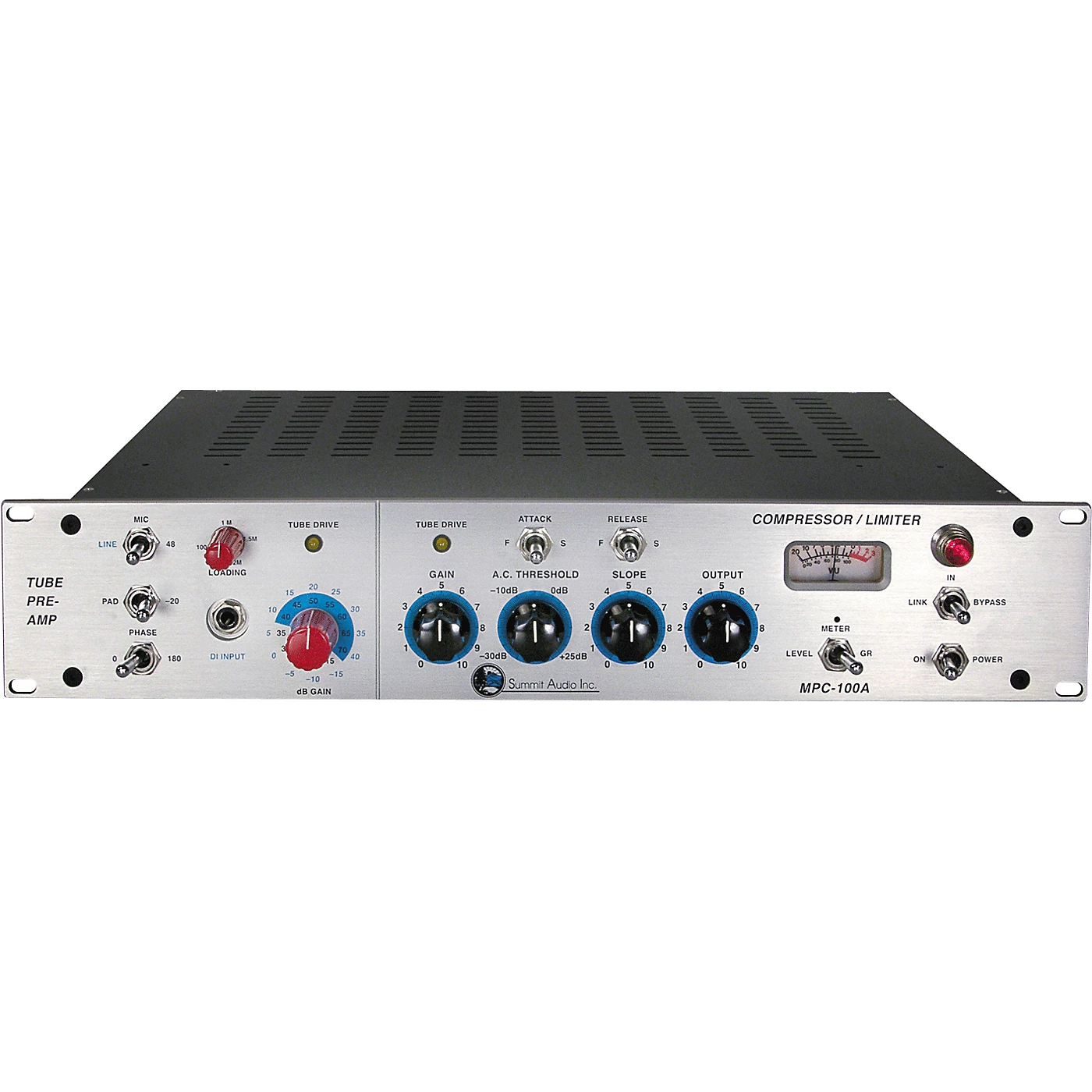 The single channel Summit Audio MPC-1OOA tube preamplifier and compressor/limiter accepts line, microphone, and Hi-Z input signals. Using both tubes and solid state technology in synch with the Jensen mic transformer, the MPC-100A lends a detailed sound with harmonically complex overtones. The ultra-fast compressor is ideal for optimizing signals prior to entering the digital domain. Other details include impedance matching (loading) control on the Hi-Z input so passive guitars and bass pickups have a whole new level of tone control, true VU metering, and multiple outputs. And with the Summit Audio MPC-100A tube preamp’s 3 separate gain controls, you have endless tonal variations from clean to saturated for whatever sound you need.